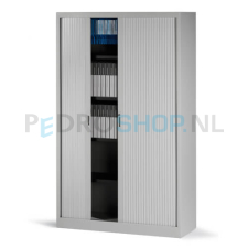 Roldeurkast standaard geleverd met zwarte legborden! De kasten zijn voorzien van 4 van binnenuit verstelbare stelvoetjes. Afsluitbare deuren van brandvertragende kunststof. Per legbord kunt u 13 standaard ordners opbergen (max 35 kg). Legborden standaard geschikt voor laterale hangmappen A4, met een spoorbreedte van 33.5 cm. Tevens mogelijkheid voor laterale hangmappen in het plafond.